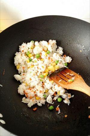 加入熟米饭,翻炒,同时打散米饭,是饭粒没有粘连。