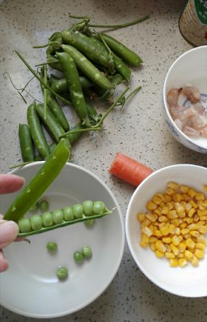 准备所有原料,青豆我用新鲜的这种,自己剥,冷冻的那种怕有色素。虾去皮,去虾肠,用盐和料酒腌制一下,这样更入味。胡萝卜切小丁