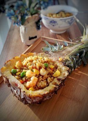 米饭盛入菠萝中,摆盘,香喷喷的泰式鲜虾咖喱饭就做好了,盛在菠萝里能闻到菠萝的香,混着咖喱的味道,真是美妙。