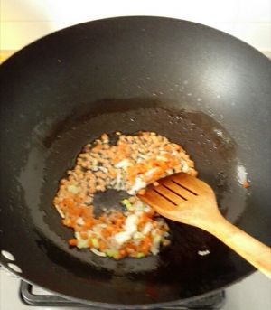 锅中留底油,下葱花、胡萝卜煸炒。胡萝卜不是很容易熟,所以先下锅