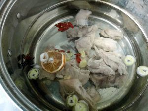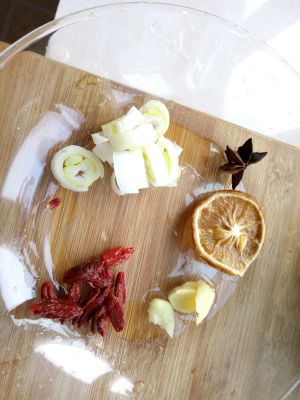 八角半个,橙子片一片,姜三片,枸杞若干,葱若干