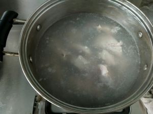 锅内放水,然后加入排骨,葱姜,枸杞八角,橙子片,料酒,大火煮沸后小火再煮十分钟