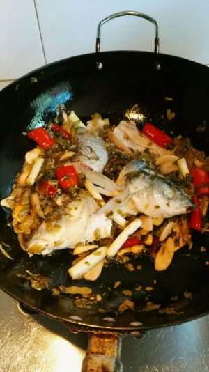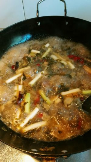 倒入葱蒜姜花椒爆香倒入鱼头鱼骨炒一下放入酸菜爆炒 放点料酒