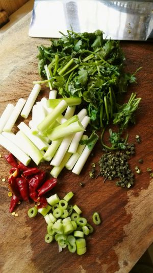 葱切段 青葱切圈 干辣椒切段 香菜切段 青花椒适量
