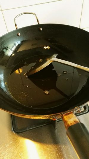 待锅烧热倒入油。待油烧辣倒入备好的调料,炒香