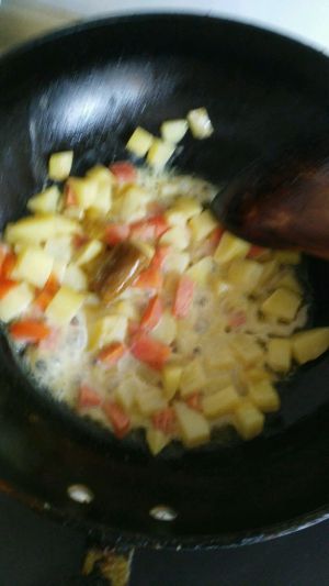 加入咖喱块,盐少许糖少许,(根据个人味口)快速翻炒