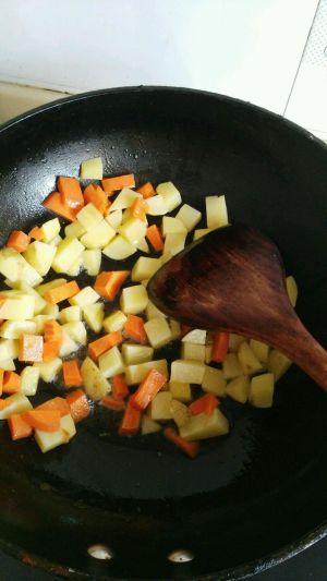 再放入胡萝卜块和土豆块翻炒均匀