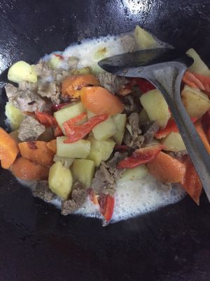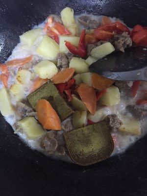 加入椰汁少许炖煮下,让椰汁入味,再加入咖喱块