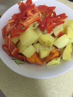 土豆和胡萝卜切块放微波炉里高温十分钟,红辣椒切菱形备用(红辣椒不需要用微波炉加热)
