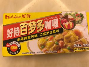 翻炒5分钟左右倒入整瓶咖喱,将咖喱拌均匀后盖上锅盖,炖15分钟。如果喜欢烂一点,可以加入热水,继续炖到水干。
