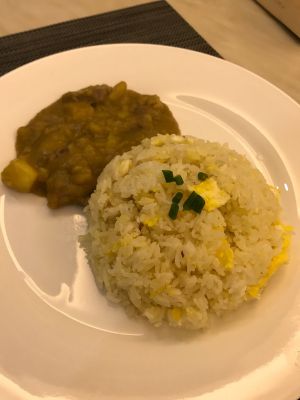 其实白饭来搭配也是可以的,只是家公买了好多鸡蛋,又想说有小孩子有鸡蛋有营养,所以才蛋炒饭的。嗯嗯,然后就装盘开动啦。