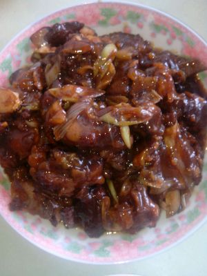 放入排骨,用中小火烧至汤汁快干时,加醋翻炒至收汁亮油,淋入少许香油翻匀就可以出锅了。这其间要注意火候,特别是最后时刻,因为汁黏稠,很容易炒糊