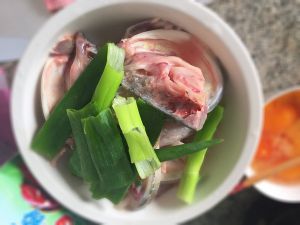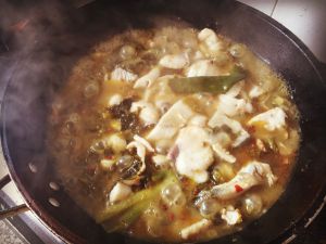 锅中热油,放入姜蒜爆香,再倒入酸菜翻炒,倒入鱼骨鱼头翻炒。这时鱼片腌制好后加入淀粉调匀