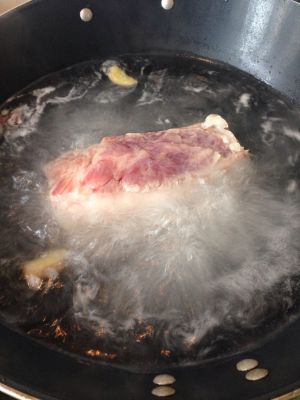 锅内烧水,下五花肉,小煮10分钟,捞去浮沫。