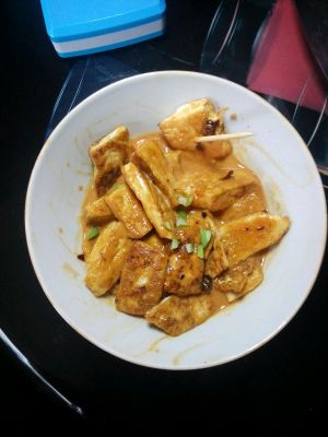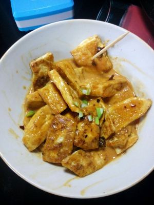 调好芝麻酱,放入适量盐和老干妈,把煎好的豆腐放入,调好,撒上绿怱便好,有芝麻的的亲可以放些芝麻。