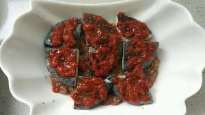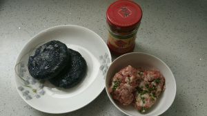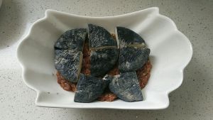臭豆腐冲洗一下各切成四块铺在肉糜上