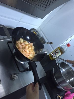 炒出香味后放入虾翻炒