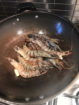 大虾,洗干净,油下锅,放姜,放大虾