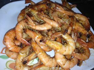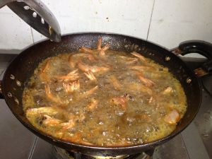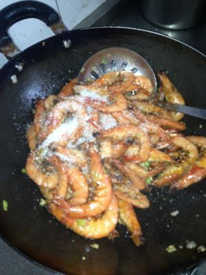 葱姜蒜炒出香味,把炸好的虾倒入锅,翻炒加糖、盐,糖盐的比例3:1,翻几下出锅前放少许味精,生抽。