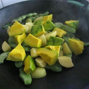 土豆洗净去皮切块,南瓜洗净去皮切块,豆角洗净