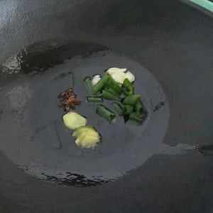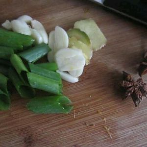炒锅到油烧热爆香葱姜,大料和桂皮。