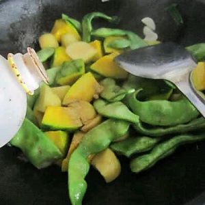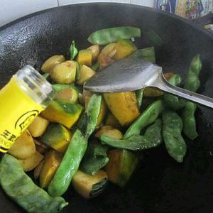 豆角放入后要炒到豆角成鲜艳的绿色后,陆续加入适量的糖、耗油、酱油继续不停的煸炒直到豆角稍微软了即可、先把硬的蔬菜煸炒这样会更入味道。
