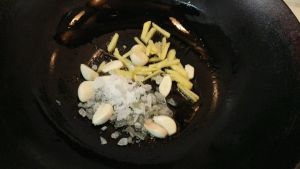 小火热锅放油,放入姜丝,蒜瓣,冰糖,炒化。