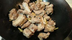 锅里倒点油,把排骨倒进去翻炒一下,别小手一抖就油倒多,因为本身排骨油脂已经够丰富,你给点阳光它就灿烂了的,炒到颜色稍深就OK 注意不要炒太久,不然口感会很老~