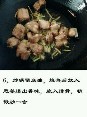 将油下锅,预热,当温度到达8成熟,下姜,排骨,炒到黄,下水,倒上醋 冰糖,待水干,放点盐。到盘