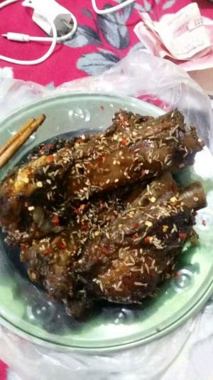 锅里底油'炒姜蒜'排骨'放调好的汁'有淀粉一粘就出锅'