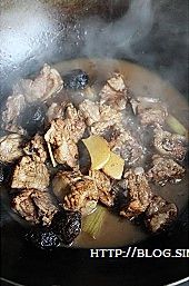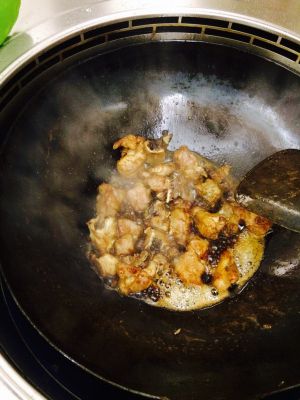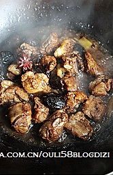 倒入排骨翻炒,加料酒,老抽,生抽,糖。