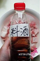猪肋排叫卖肉小哥剁成小块,放入盘中,加几片生姜片,倒入料酒没过底层。保鲜膜盖上,放冰箱里腌一段时间