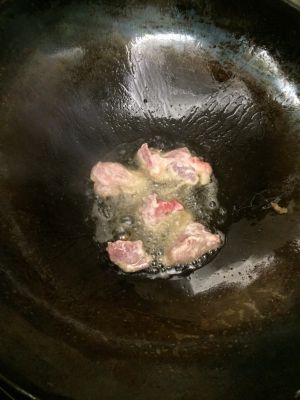 锅内加入油。烧热后,加入排骨炸至金黄捞出