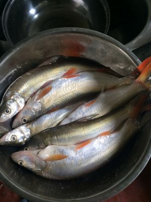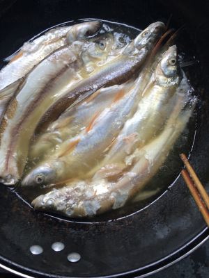 油热,把腌好的鱼骨部分煎至变色发黄。