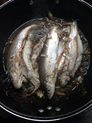 把炸好的鱼倒入油锅里,放水,水要盖过鱼,盖上锅盖,开小火闷。