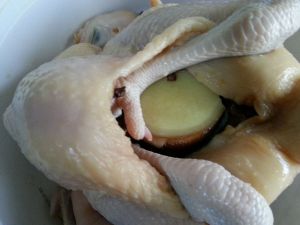 将姜片、香菇以及香葱塞进鸡肚子里。