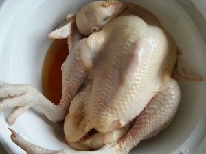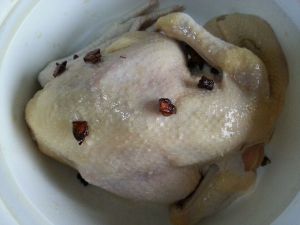 将姜丝、大葱段、香菜、香叶、干辣椒、茴香和桂皮塞入鸡肚内,腌制3至4小时。