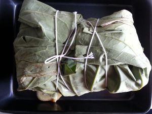 用荷叶将鸡包裹好