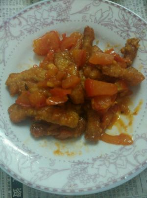 熬糖醋汁,番茄切丁,热锅,放油,放番茄编出番茄汁,放一勺番茄酱,放醋,放糖,小火熬,再倒入炸好的肉条,起锅。