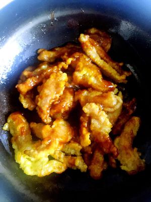 小火收汁然后倒入炸好的肉条,翻炒均匀即可。