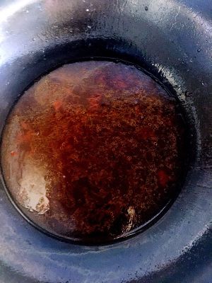 接下来做酸甜汁。锅烧热放入沙司翻炒均匀。