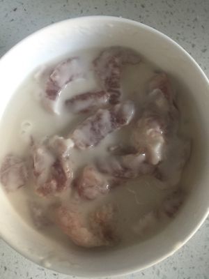 淀粉加入适量水调匀成糊状,把腌好的肉条放入。