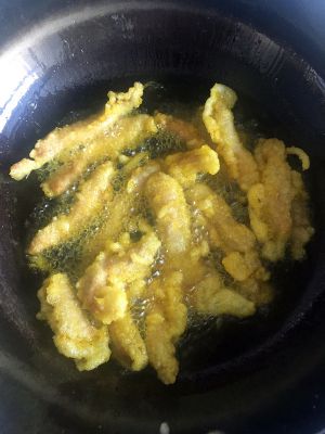 锅里放入适量的油,中小火烧热,裹好水淀粉的肉条一根一根的放入油锅中下火炸制。