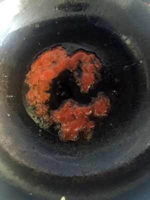 锅中加入一些油 油热后加入番茄酱与调好的料汁 加入姜末 葱末 如果感觉不够粘稠 可加入一些欠粉汁