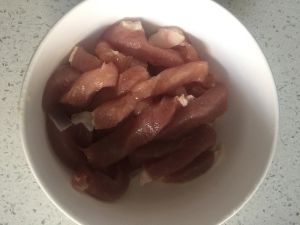 里脊肉切成宽度1.2公分的长条,用料酒和盐腌制20分钟左右。