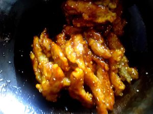 锅中放入调好的汁,加热冒泡,放入炸好的鸡胸肉翻炒