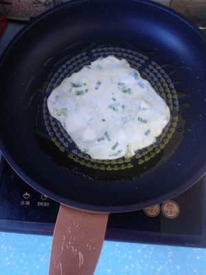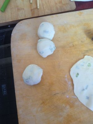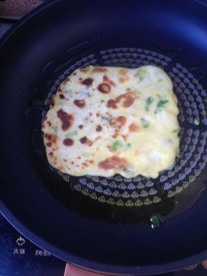 锅里不放油,把面坯放入后,在朝上的一面倒一点点油,用铲子抹平,然后翻面,在另一面上再倒油,摊饼直到出葱香即可