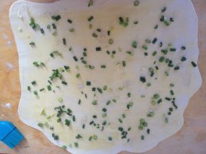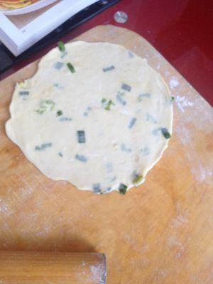 把面团擀成长方形,然后抹一层油,撒上盐和白胡椒粉,再撒上葱花