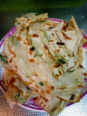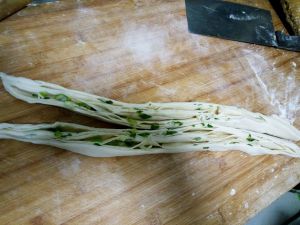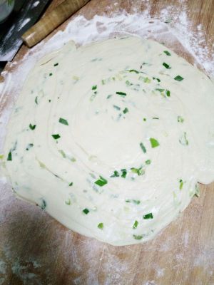 每一份擀成薄面片,涂抹一层薄薄的葱油