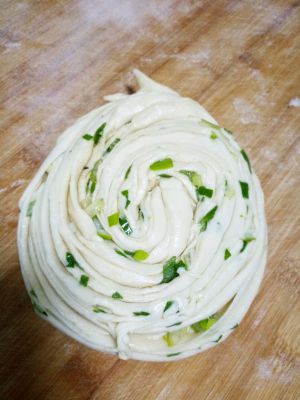 醒发好的面团擀成饼,抹上油酥,撒上葱花